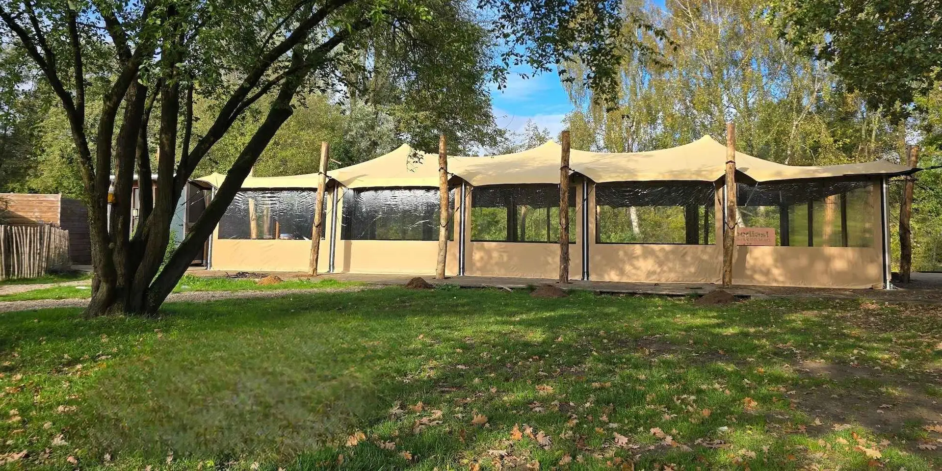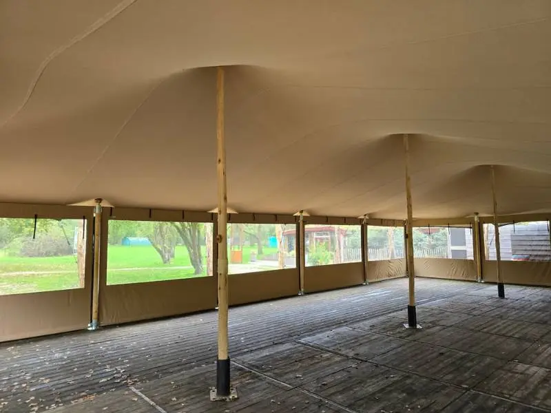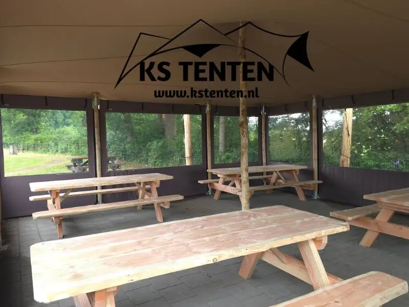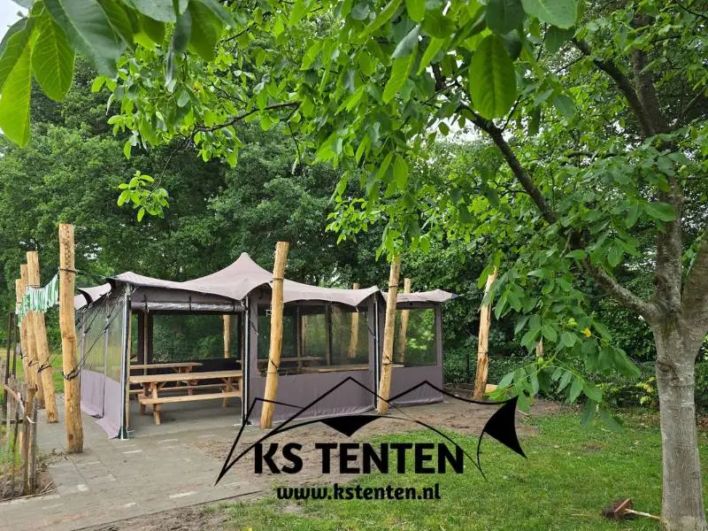 Het tentdoek is 100% waterdicht. De zijwanden houden wind en kou buiten de tent. En dankzij de hardhouten palen is je tent oersterk en stormvast.